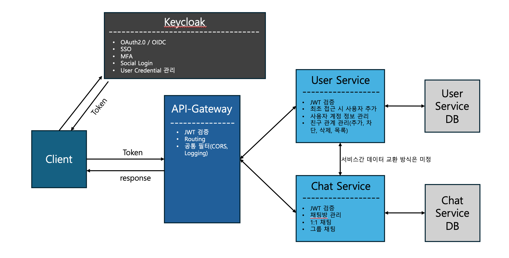 이 프로젝트는 Keycloak을 인증/인가 서버로 분리하고, 그 위에 Gateway / 서비스(User, Chat) 구조로 기능을 나누어 구성했다.