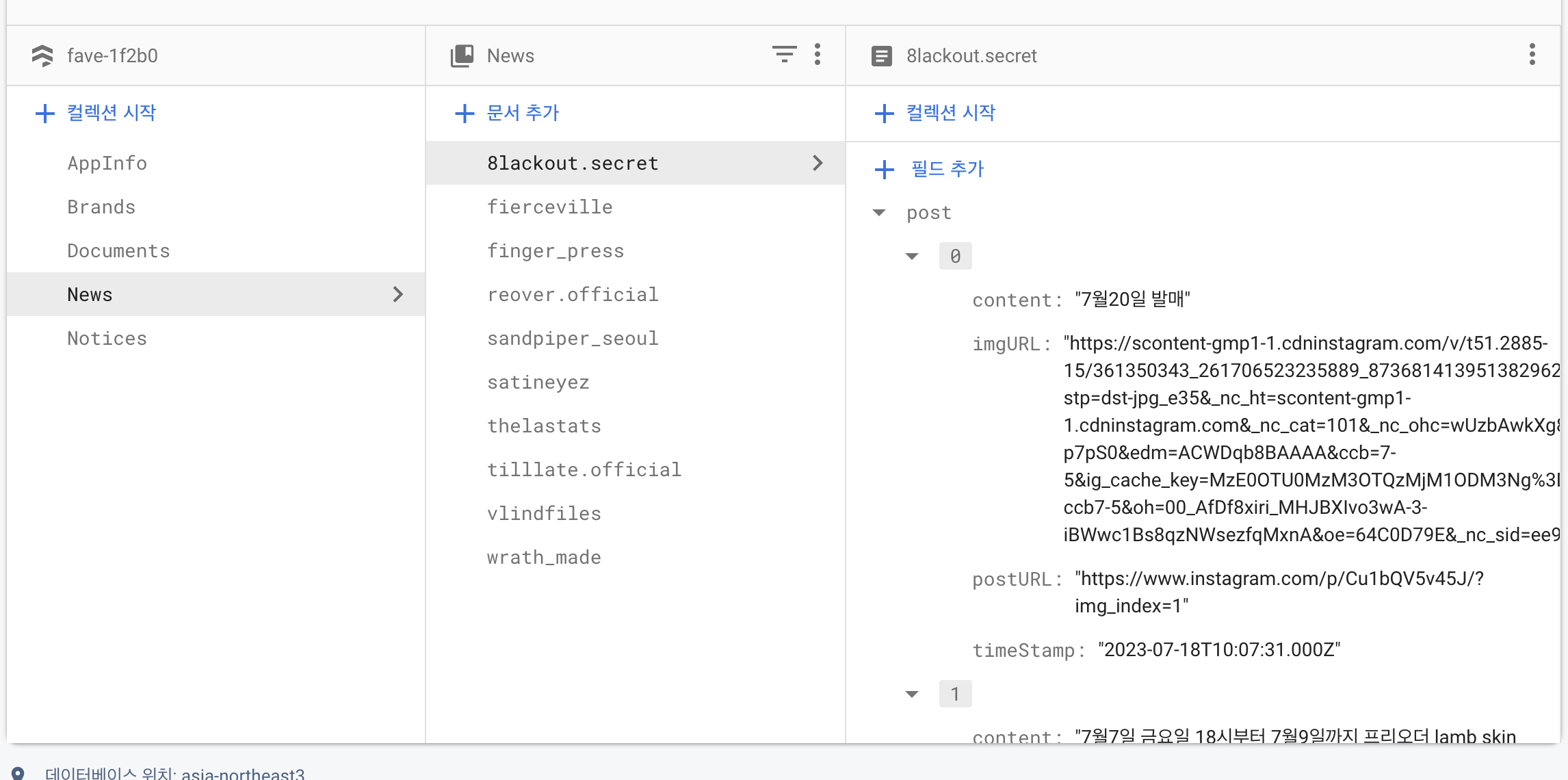 아래의 첫번째 사진은 표준적인 방식으로 저장한 방식이고 두번째사진은 post라는 배열을 타입으로 가지는 필드에 여러 news가 들어가 있는 형태입니다.